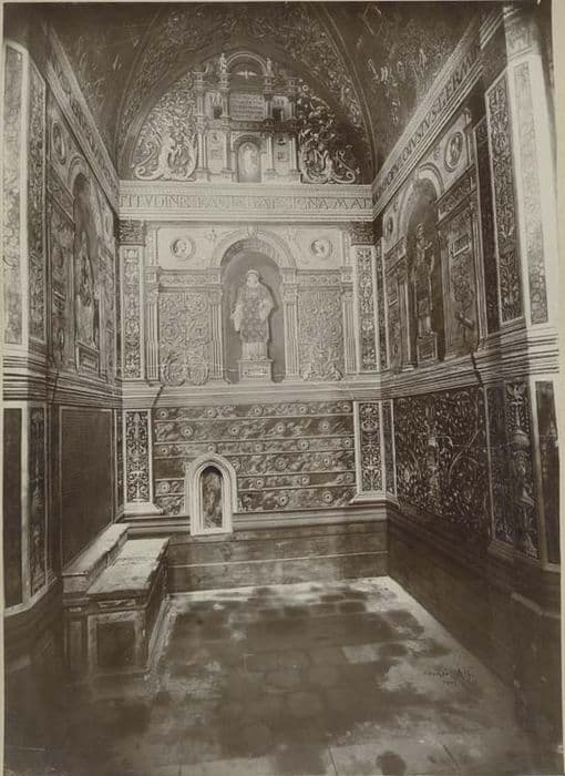 figures bibliques (Apôtre : saint Jacques le Majeur, saint Jacques le Mineur, saint Jean, saint Matthias, saint Matthieu, saint Philippe, saint Simon, saint Thomas) ; figures bibliques (petit prophète : Aggée, Habacuc, Jonas, Michée, Zacharie) ; figures bibliques (grand prophète : Daniel, Ezéchiel) ; figures bibliques (homme de l'Ancien Testament : Adam, Eléazar, Job, Patriarche) ; figure biblique (Eve) ; figures (saint Ambroise, saint Antoine, saint Augustin, saint Christophe, saint Grégoire, saint Jean l'Evangéliste, saint Jérôme, saint Joseph, saint Louis, saint Martial, saint Martin, saint Michel, saint Roch, saint Salvy, saint Sébastien, saint Silvestre, saint Urbain, saint Valérien) ; figures (sainte Agathe, sainte Agnès, sainte Anastasie, sainte Apolline, sainte Barbe, sainte Catherine, sainte Catherine de Sienne, sainte Cécile, sainte Claire, sainte Madeleine, sainte Marie l'Egyptienne, sainte Marguerite, sainte Marthe, sainte Suzanne, sainte Ursule, sainte Véronique) ; figure biblique (roi d'Israël : Joachim) ; scène biblique (Couronnement de la Vierge, Transfiguration, Apparition aux apôtres, Les vierges sages et les vierges folles) ; figure mythologique (Sibylle phrygienne, Sibylle libyque, Sibylle persique) ; ornementation (en fond, candélabre, rinceau)