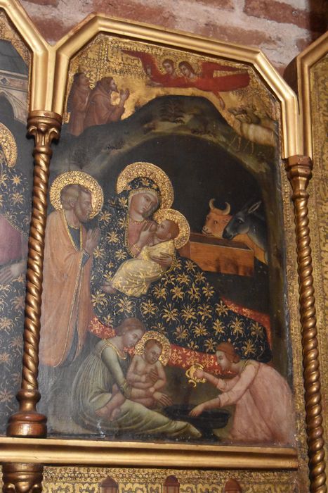 La Vierge à l'Enfant est représentée au centre de la composition. A l'étage supérieur les panneaux représentent des scènes de la Vie de la Vierge et à l'étage inférieur sont représentées des scènes de la vie du Christ.