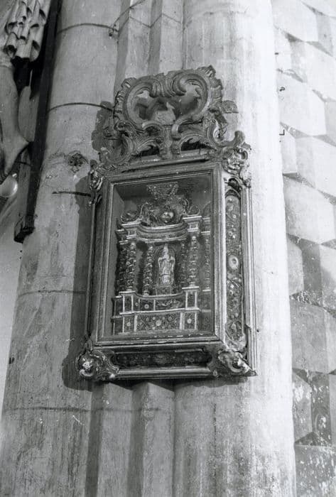Tableau-reliquaire composé d'un petit retable en relief dans un cadre en bois doré. Le cadre est orné de nombreux motifs de rinceaux et autres ornements foisonnants, et comporte dans sa partie supérieure un large décor ajouré de rinceaux en volutes végétales. Le retable figuré à l'intérieur de ce tableau-reliquaire est formé de six colonnettes torses en papier coloré et en partie doré reposant sur une large base à ressauts et compartiments soutenant un entablement, lequel est sommé d'un décor sculpté d'accolades placées de part et d'autre d'un médaillon en forme de coeur ; cette structure évoquant un baldaquin d'autel (ou ciborium) surmonte une niche abritant une statuette d'évêque en bois doré.