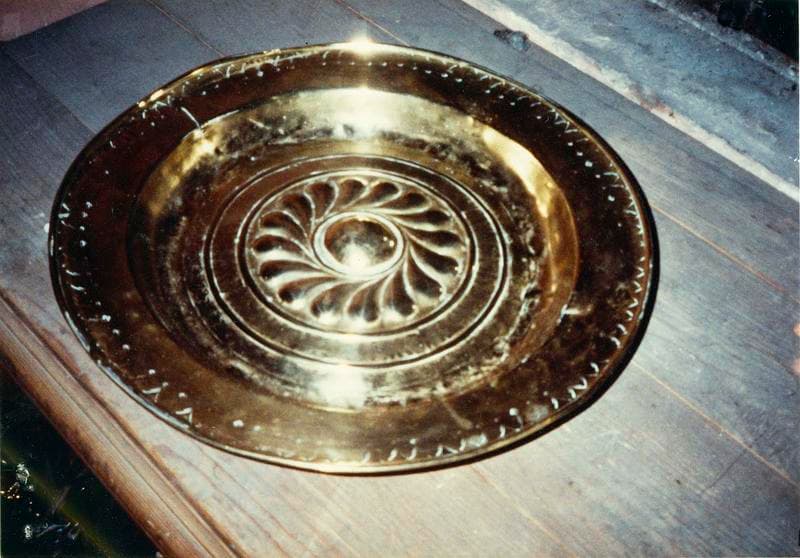 Plat circulaire à rebord. Décor : une marguerite dont les pétales dessinent une sorte de rouelle, s'inscrit à l'intérieur de deux cercles concentriques.