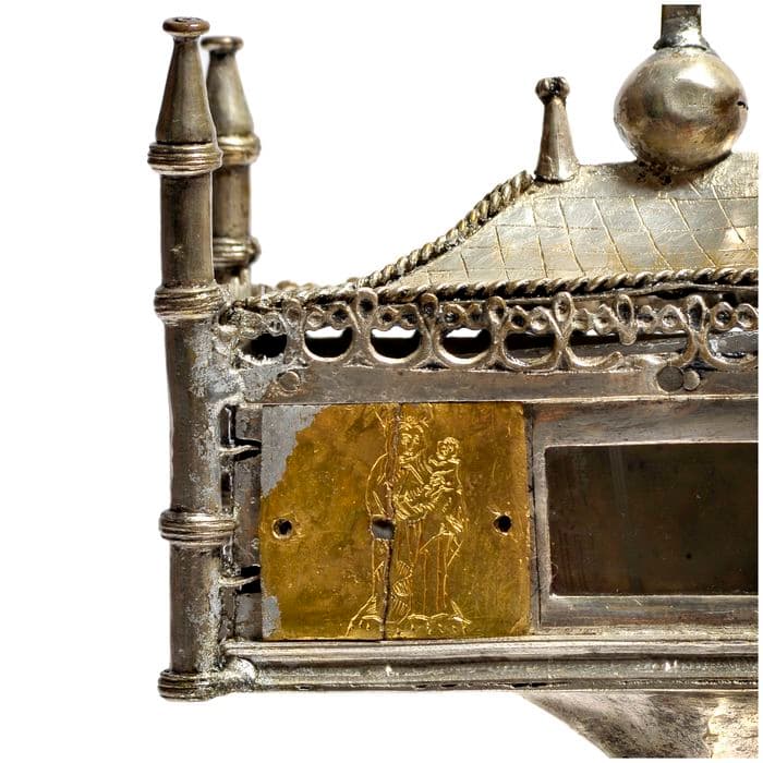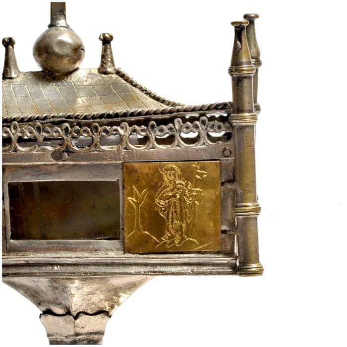 Corps du reliquaire en forme d'édifice, couvert d'un toit à quatre pentes formant un couvercle amovible. Il est cantonné de quatre clochetons aux angles. (La croix, au sommet, semble un ajout postérieur). Sur la face antérieure, ouverture vitrée. De chaque côté, deux plaques de cuivre doré qui semblent rapportées. Base lobée hexagonale. A la naissance du pied, ceinture de créneaux.