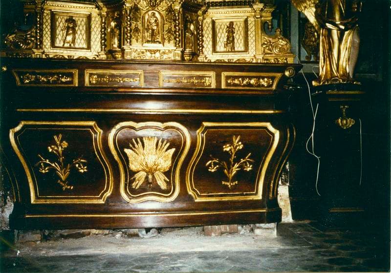 Autel-tombeau de formes galbées. Le devant se divise en trois panneaux. Moulures et motifs sculptés sont dorés.