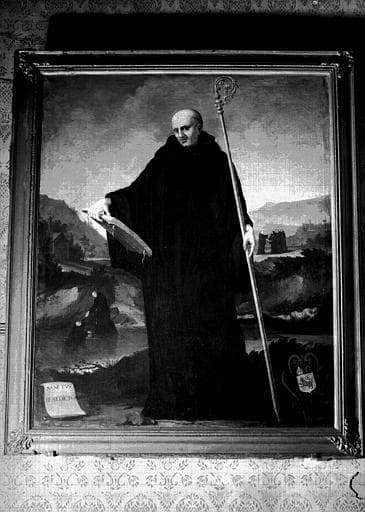Saint Benoît debout vêtu de la coule noire de son ordre tient un grand livre de sa main droite et une crosse de la main gauche. Dans un paysage apparaissent divers miracles du saint. A gauche, le moine PLacide qui allait se noyer est secouru. A droite, saint Benoît se roule nu dans les ronces épineuses. Au-dessus sans doute la fondation de l'abbaye du Mont Cassin où saint Benoît donna sa règle à ses premiers moines. Sur un parchemin en bas à gauche : 'SANCTUS BENEDICTUS'.