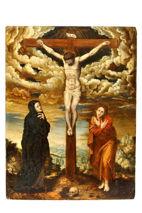Christ en croix se détachant d'un ciel très nuageux. La Vierge au manteau bleu foncé, à gauche, saint Jean en vêtement brun à droite. On aperçoit un paysage de montagne et la ville de Jérusalem dans le fond. Au pied de la croix un crâne.