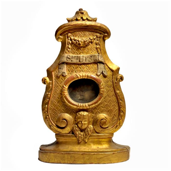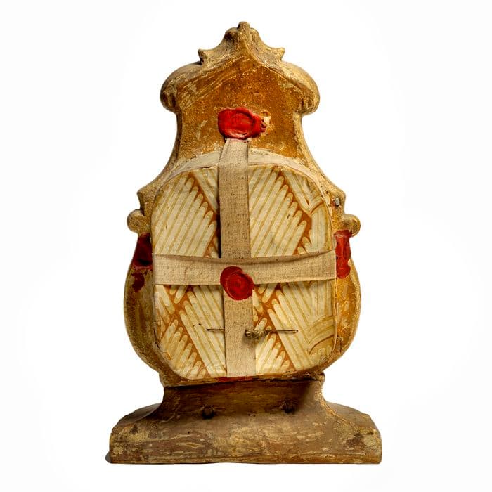 En forme de blason renversé, avec un décor de fleurettes et guirlandes. Au centre, une monstrance ovale, permet d'apercevoir les reliques. Au-dessus, un ruban argenté porte l'inscription peinte en lettres noires.