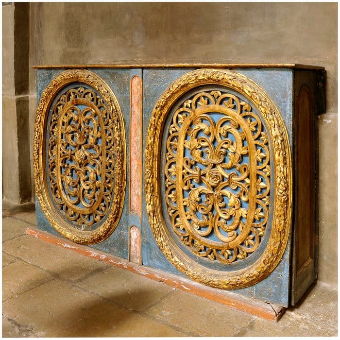Armoire à deux battants constituée de deux panneaux de boiserie (caisson de plafond ?) peint en bleu avec décor en relief, doré à la feuille.