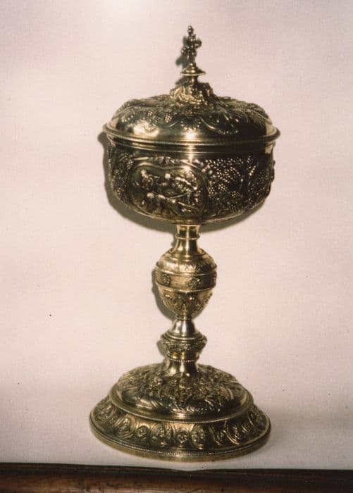 Pied circulaire légèrement bombé ; noeud ovoïde ; couvercle bombé.