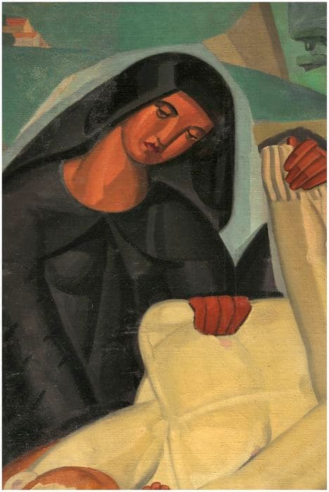 Le corps du Christ est soutenu par les trois Saintes Femmes. A droite, la Vierge Marie assiste, éplorée, à la scène.