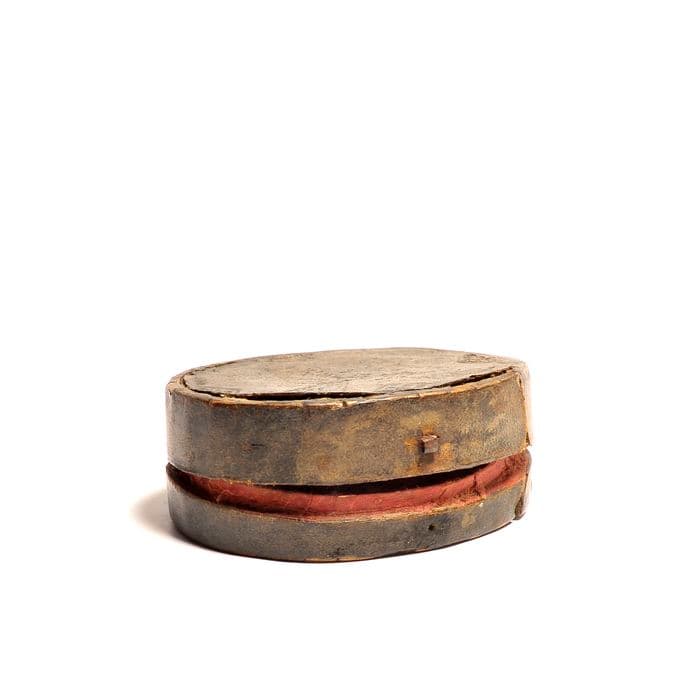 Petite boîte ovale en carton, couverte de cuir noir et garnie de à l'intérieur de paperoles.