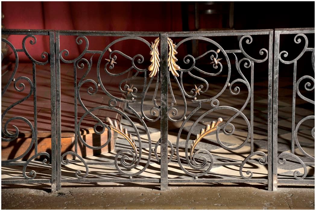 Clôture basse à deux vantaux de porte encadrés par six panneaux de contre-porte à alternance de panneaux larges et étroits : fers plats, clous rivetés et assemblages à billes. Le décor rapporté est doré de même que les assemblages à billes. La grille est surmontée d'une main-courante en bois vernis. Les portes sont garnies des médaillons historiés, en fer doré.