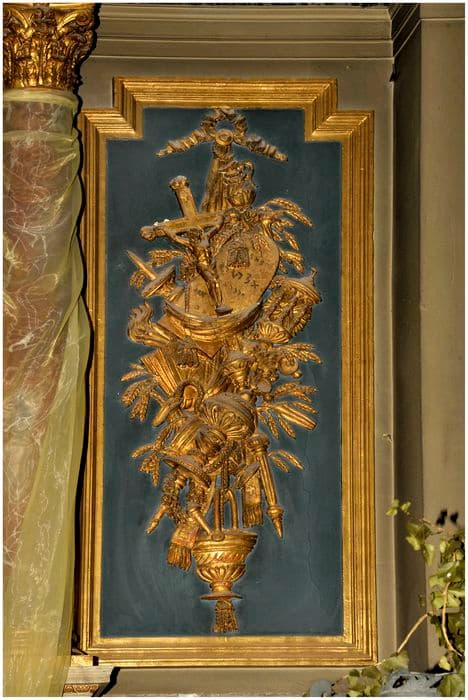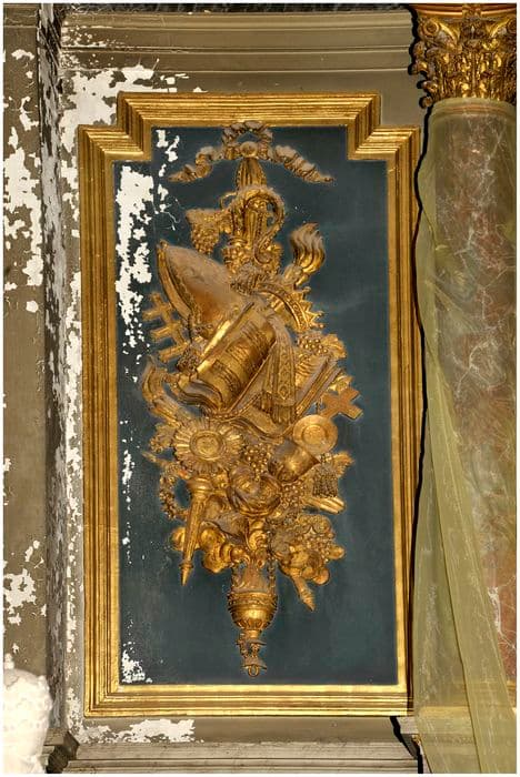 Retable à niche centrale et deux travées latérales séparées par des colonnes doubles surmontées d'un entablement. Sur les travées latérales, deux panneaux de trophées en bois peint en bleu avec motifs en légers reliefs dorés à la feuille.