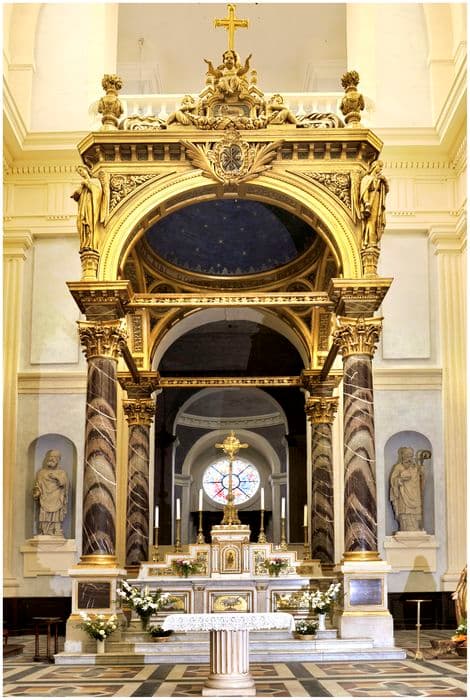 Baldaquin composé de quatre colonnes soutenant une coupole sur pendentif dont les écoinçons intérieurs sont ornés de médaillons circulaires. Surmontant les quatre colonnes, dans les angles, des statues dorées en ronde-bosse.