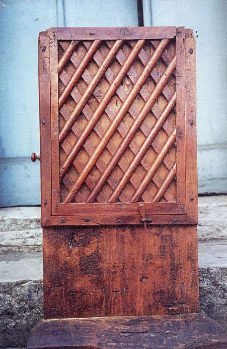 Ce confessionnal portatif est constitué d'une grille en bois rétractable et d'un petit repose-mains.