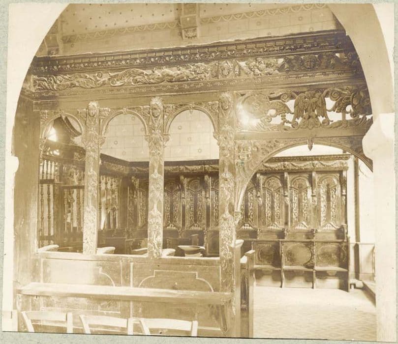 20 stalles au fond et 14 au 1er rang. Le lambris du fond de chaque stalle est formé d'un fond de niche cintrée à perspective arrêtée par des pilastres montant jusqu'à la frise laquelle est ornée de rinceaux et couronnée par une corniche également ornée.