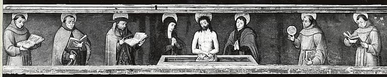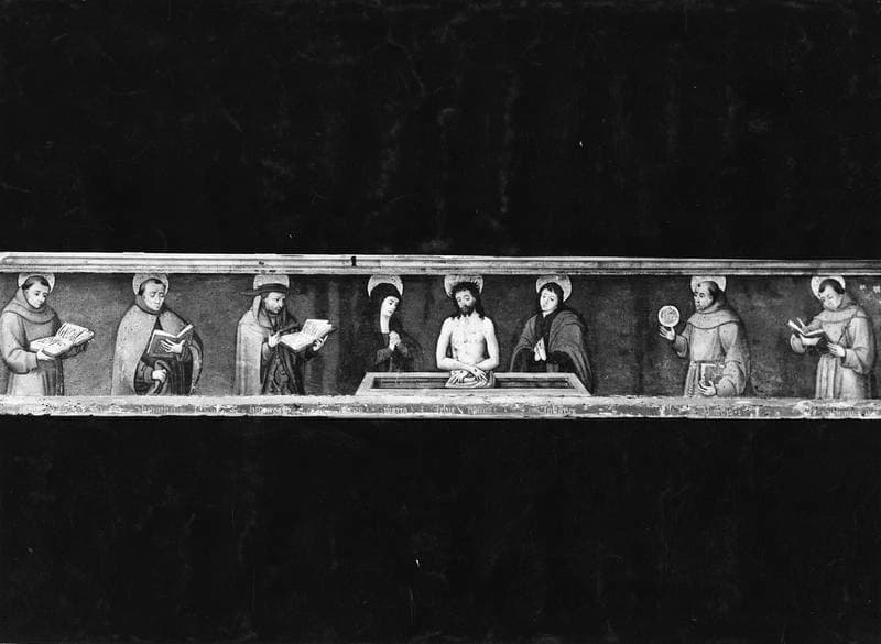 prédelle : Christ au tombeau entouré de la Vierge, saint Jean et plusieurs saints