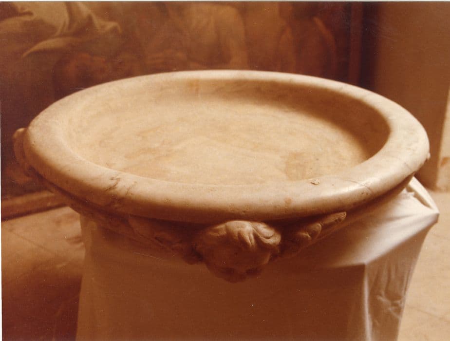 Le renflement de la vasque est orné de quatre têtes d'anges. Quatre pieds en fer maintiennent l'équilibre de cette vasque.