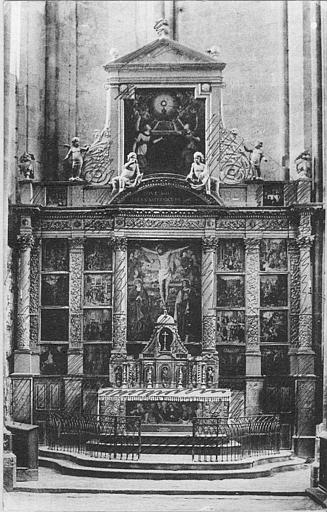 Grand retable avec au centre le Christ en croix et autour de ce tableau, 16 médaillons représentant des scènes de la Passion.