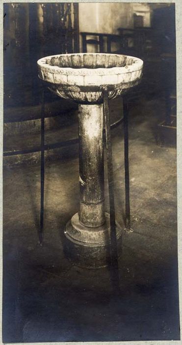 Le listel extérieur de la vasque porte l'inscription suivante : HOC POVS FIERI FECIT REVEIEND O JOHNES ANDREAS EX COMITIB VITIMILEI PRIOR ET CO DNS SEGLHANIS. Date : 1491.