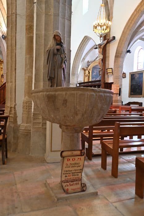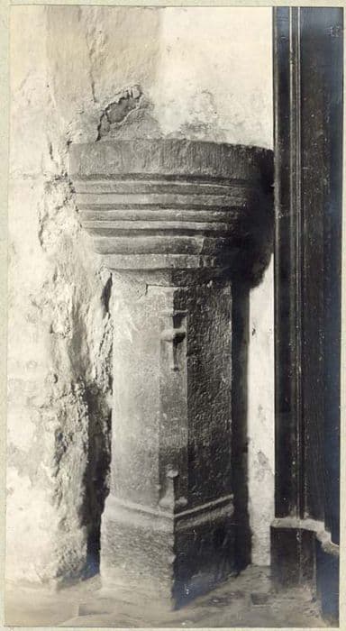 Cuve baptismale ornée de godrons sur balustre cannelé.