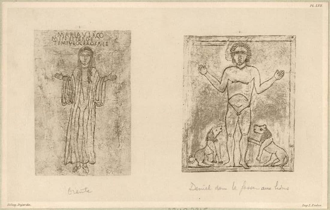 Décorées de figures gravées au trait : le Sacrifice d'Abraham, Daniel dans la fosse aux lions, Orante tournée à gauche et Orante tournée à droite. Art chrétien.