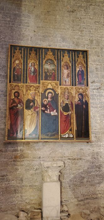 retable, 10 tableaux : Vierge à l'Enfant entre saint Jean-Baptiste et saint Pierre, Un évêque et abbé, Le Christ en croix entre saint Jean et la Vierge, Saint Martin et saint Victor, Saint Sébastien et sainte Marguerite