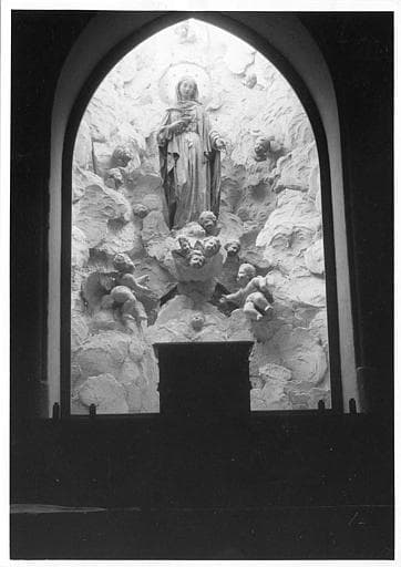 Sculpture utilisant les techniques de la ronde-bosse, du haut-relief et du bas-relief représentant la Vierge debout dans les nuées, au milieu d'anges.