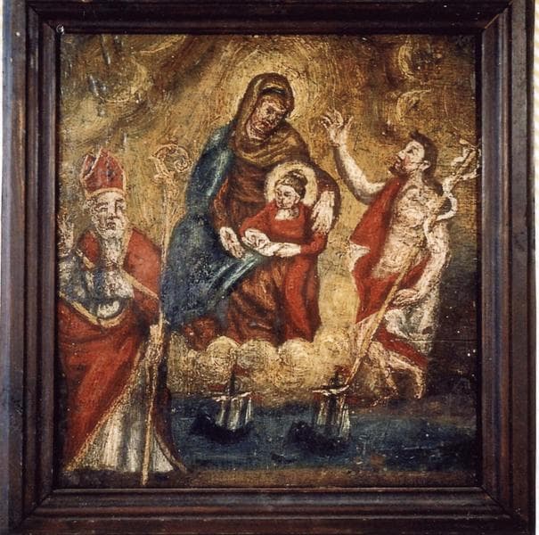 POP | Plateforme ouverte du patrimoineex-voto 4 avec cadre : Education de la Vierge avec saint Jean-Baptiste et un évêque sur fond de motif naval