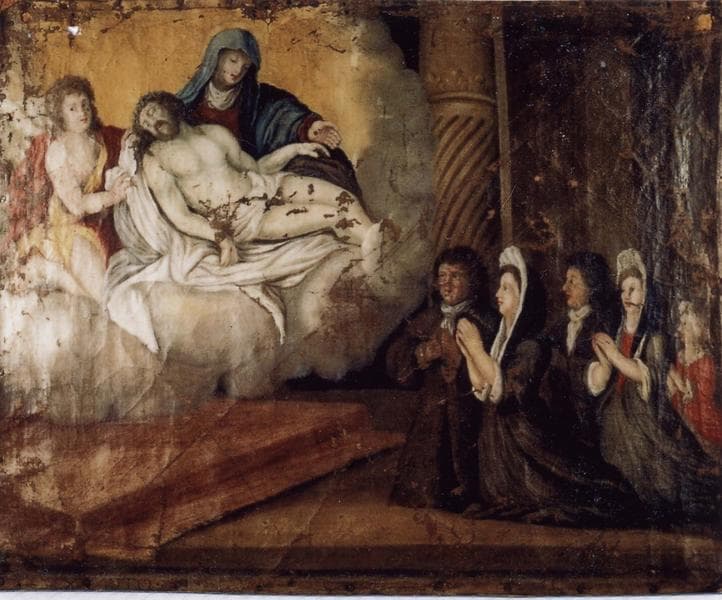 ex-voto 14 : Une famille en prière devant Notre Dame de Pitié et saint Jean-Baptiste (?)