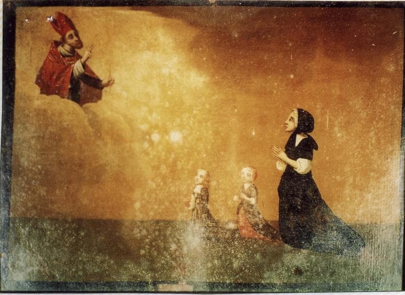 ex-voto 24 avec cadre : Une dame accompagnée de ses deux enfants en action de grâce devant un évêque