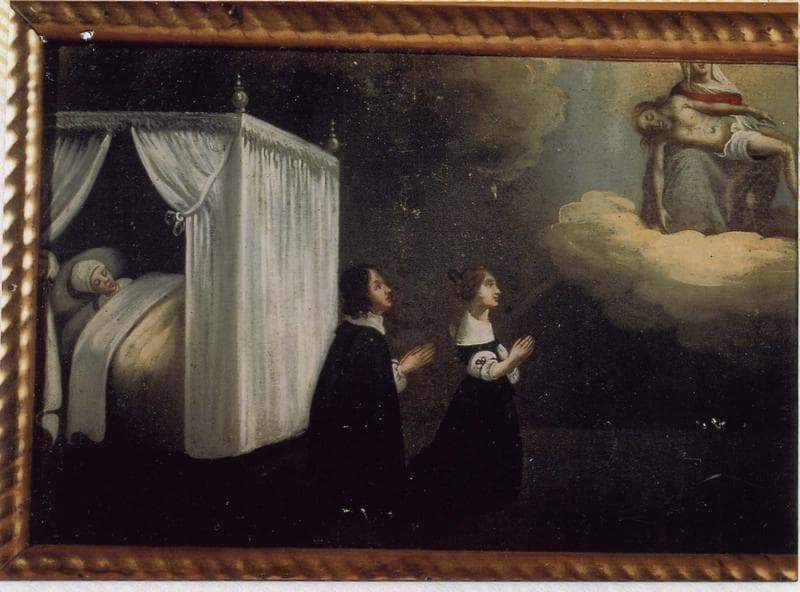 POP | Plateforme ouverte du patrimoineex-voto 38 : Couple en prière devant Notre-Dame-de-Pitié. Malade alité en attente de guérison