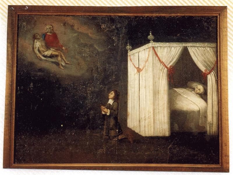 ex-voto 41 avec cadre : Guérison d'un malade alité. Homme en prière devant Notre-Dame-de-Pitié