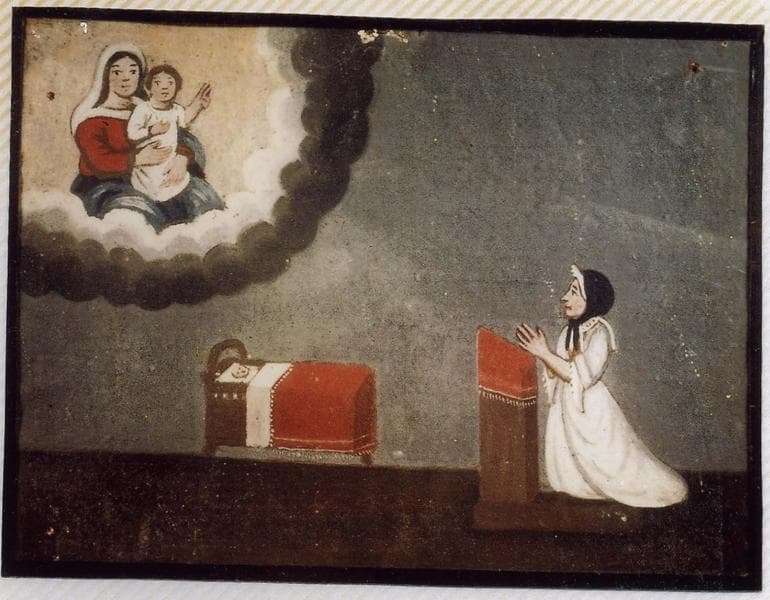 ex-voto 61 : Guérison d'un enfant dans un berceau. La mère implore la Vierge à l'enfant sur son prie-dieu