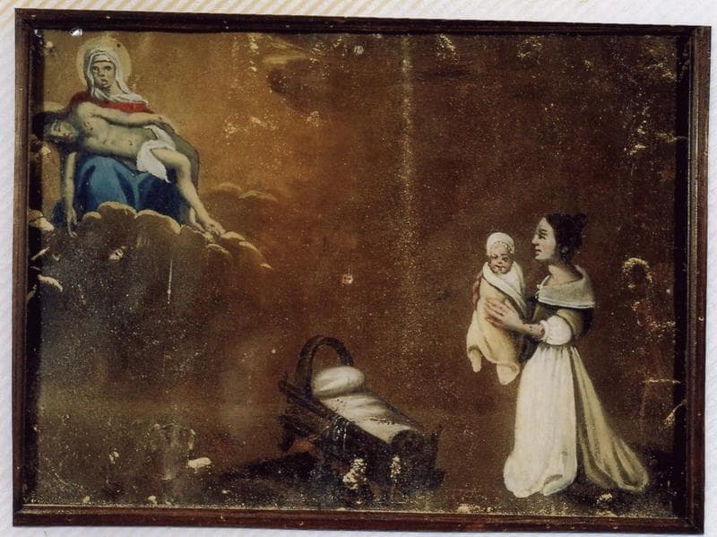 ex-voto 62 avec cadre : Guérison d'un enfant. La mère présente son enfant emmitouflé à Notre-Dame-de-Pitié
