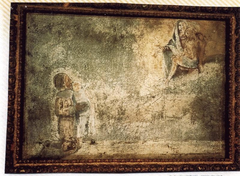 ex-voto 69 avec cadre : Personnage tenant un enfant rend grâce à Notre-Dame-de-Pitié