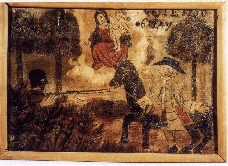 POP | Plateforme ouverte du patrimoineex-voto 84 avec cadre : Cavalier attaqué par un homme cagoulé muni d'un fusil. Remerciement à la Vierge à l'enfant
