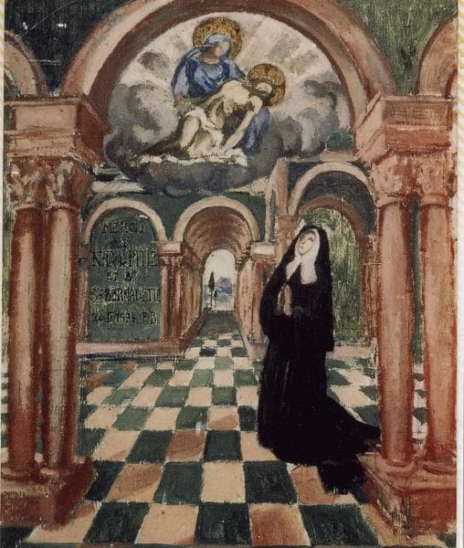 POP | Plateforme ouverte du patrimoineex-voto 94 : Sainte Bernadette en prière dans son cloître nivernais devant Notre-Dame-de-Pitié