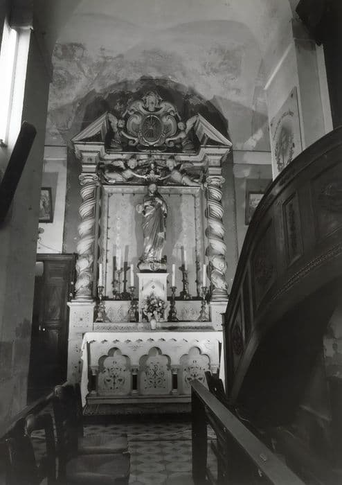 Retable à deux colonnes torses soutenant un entablement à ressaut couronné d'un fronton brisé comportant, en son centre, un cartouche. Sous l'entablement se tiennent deux statues d'anges tenant une couronne au-dessus de la tête de la statue posée sur le tabernacle.