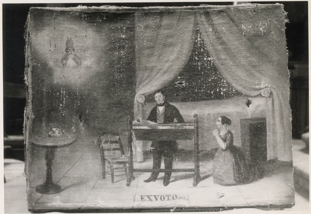 ex-voto : Deux personnages devant un berceau dans une chambre