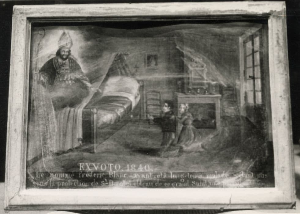 POP | Plateforme ouverte du patrimoineex-voto : Deux personnes agenouillées dans une chambre