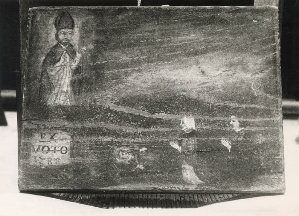 POP | Plateforme ouverte du patrimoineex-voto : Deux personnages agenouillés devant un berceau