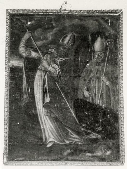 Le saint, debout, en vêtement épiscopaux, terrasse le dragon de sa lance. Un autre évêque se tient derrière lui.