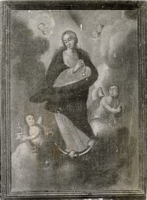La Vierge est debout sur un croissant de lune, entourée de deux anges portant des objets.