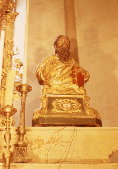 Le saint tend sa main droite vers l'avant et tient un livre de sa main gauche. Il est barbu. Son buste repose sur un socle dont le sommet est orné de têtes d'angelots ailés.