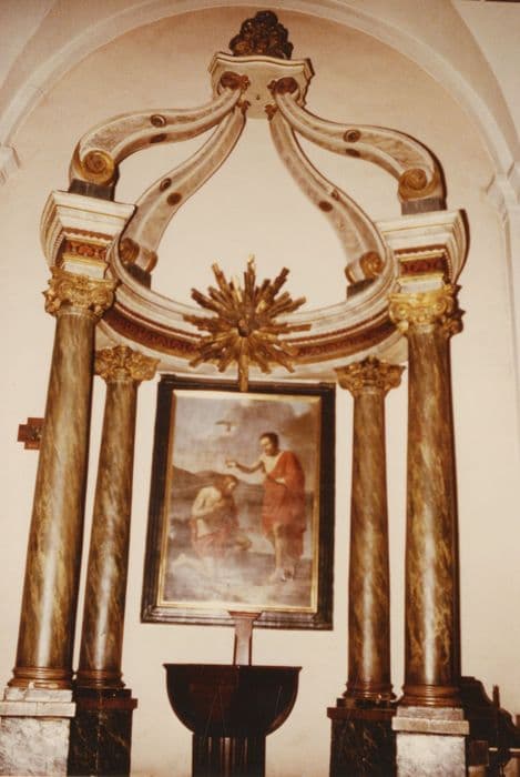 Fonts baptismaux en bois, au fût circulaire, cannelé et à vasque polygonale. Un ciborium, en bois, surmonte les fonts et le tableau. Il est composé de quatre colonnes, peintes en faux marbre, soutenant une architrave semi-circulaire, surmontée de quatre volutes se rejoignant au sommet. Un gloire de rayons lumineux orne l'architrave.