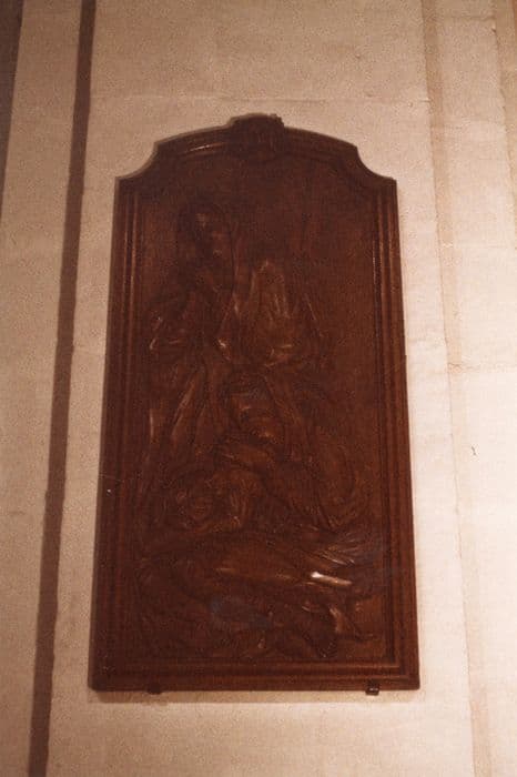 Panneau mouluré, rectangulaire, au sommet chantourné. La scène, en bas-relief, représente deux saintes femmes en pleurs, tournées vers la droite.