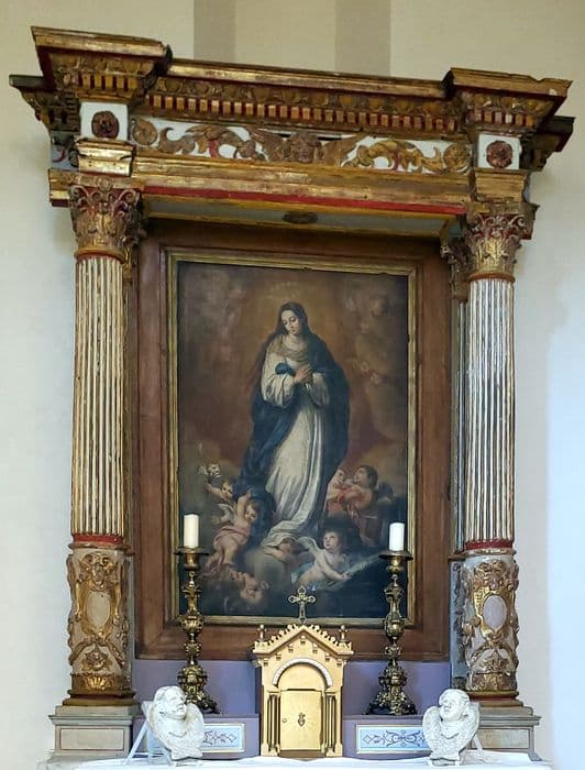 Retable, en bois doré et peint, composé de deux colonnes, sculptées en partie basse de motifs rocailles et cannelées en partie haute, soutenant un entablement à ressaut dont la frise comporte une tête d'angelot ailé.