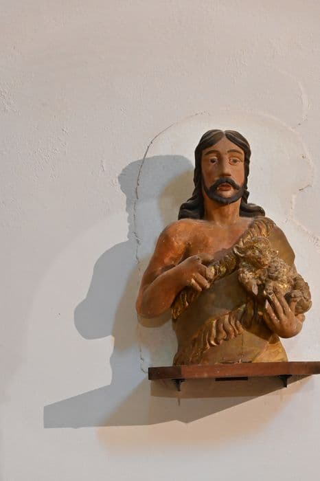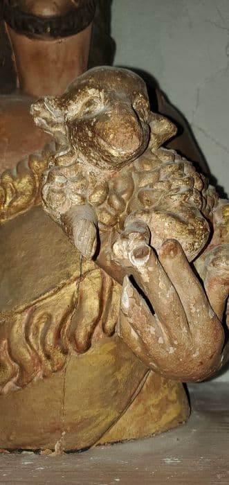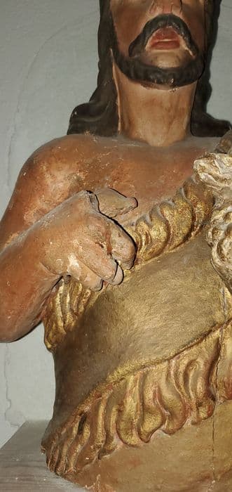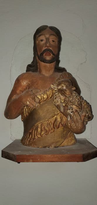 Le saint est vêtu d'une peau de bête et tient un mouton sur son bras gauche. Buste sans socle.