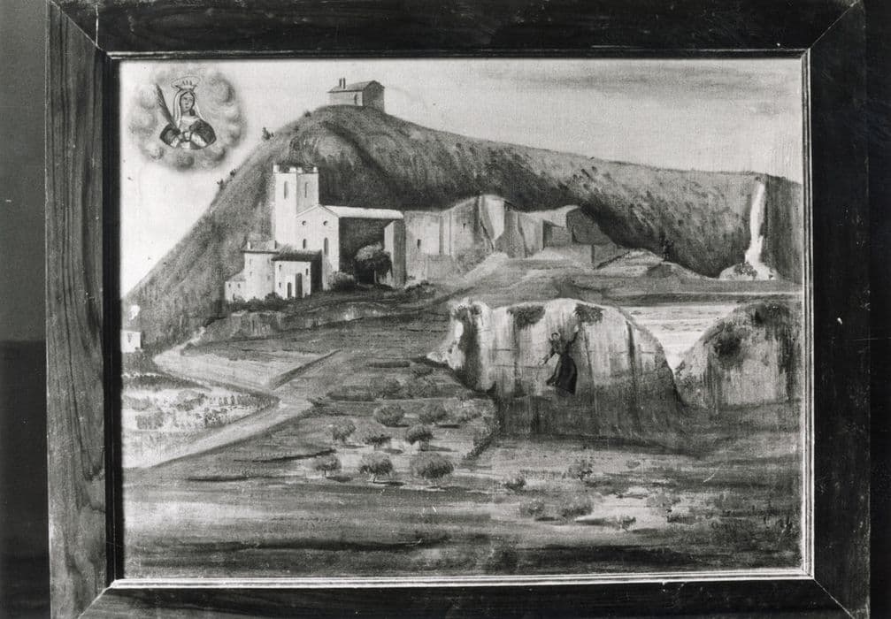 Femme tombant d'une falaise. Village représenté au second plan. Sainte Christine apparaît dans le ciel.