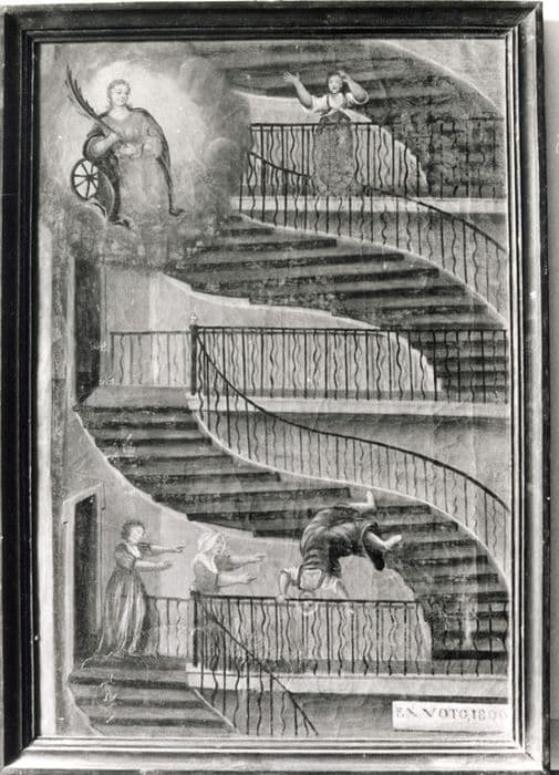 Femme tombant d'un escalier. Sainte Christine apparaît au sein d'une nuée.