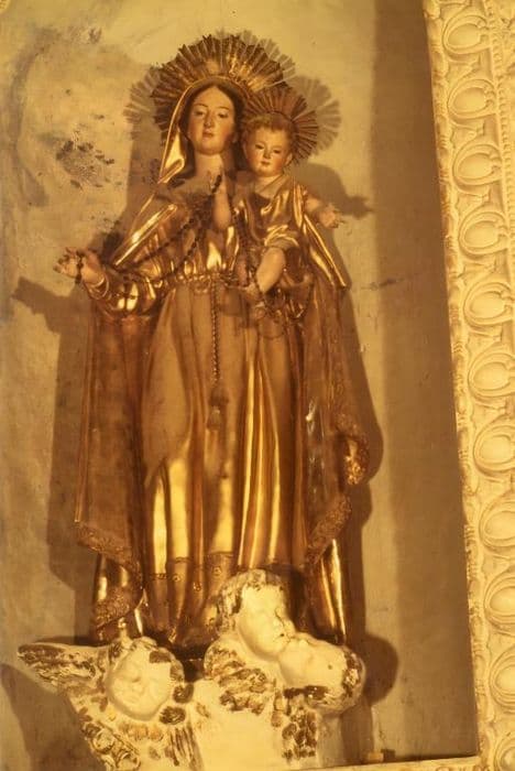La Vierge et l'Enfant se dressent sur un socle orné de têtes d'angelots ailés. Ils sont auréolés de rayons lumineux.